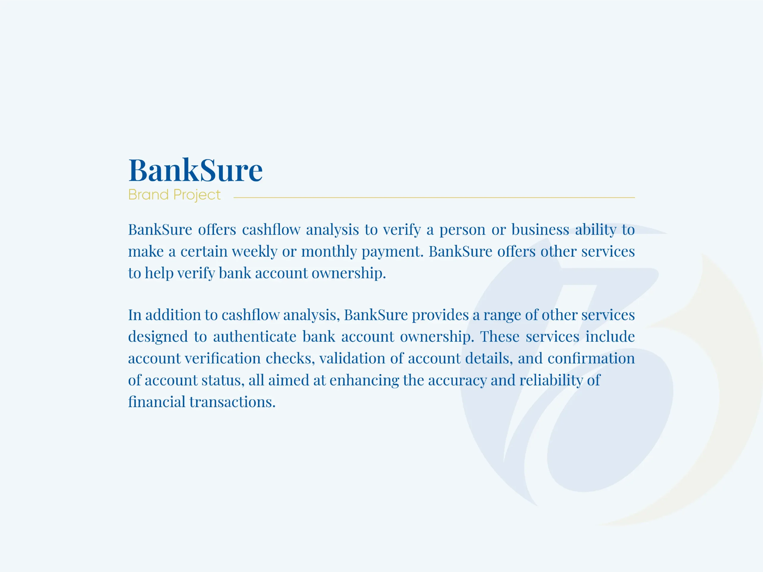 BankSure offers cashflow analysis to verify a person or business ability to make a certain weekly or monthly payment. BankSure offers other services to help verify bank account ownership.